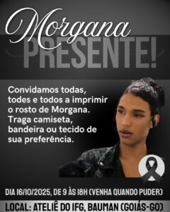 A ação será realizada no Ateliê do IFG e consiste na impressão do rosto de Morgana em camisetas, bandeiras e tecidos levados pelos participantes — um gesto simbólico de memória e solidariedade.