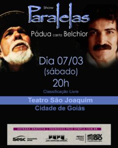 O espetáculo “Paralelas – Pádua Canta Belchior” acontece às 20h, no palco do Cine Teatro São Joaquim. A entrada é gratuita, com retirada de ingressos pelo Sympla, por meio do site sympla.com.br.